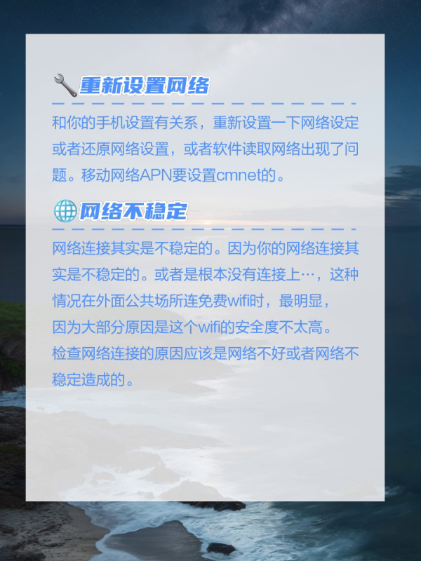 和你的手机设置有关系,重新设置一下网络设定或者还原网络设置,或者软件读取网络出现了问题。移动网络APN要设置cmnet的。