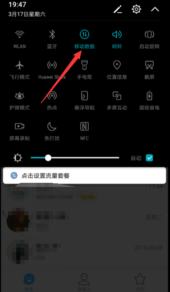 请您从手机屏幕顶部下划呼出快捷菜单,查看移动数据图标是否已点亮