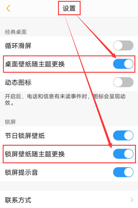 将“锁屏壁纸随主题更换”与“桌面壁纸随主题更换”开启后,手机的锁屏壁纸与桌面壁纸则会根据当前所使用的主题进行变化而变化的