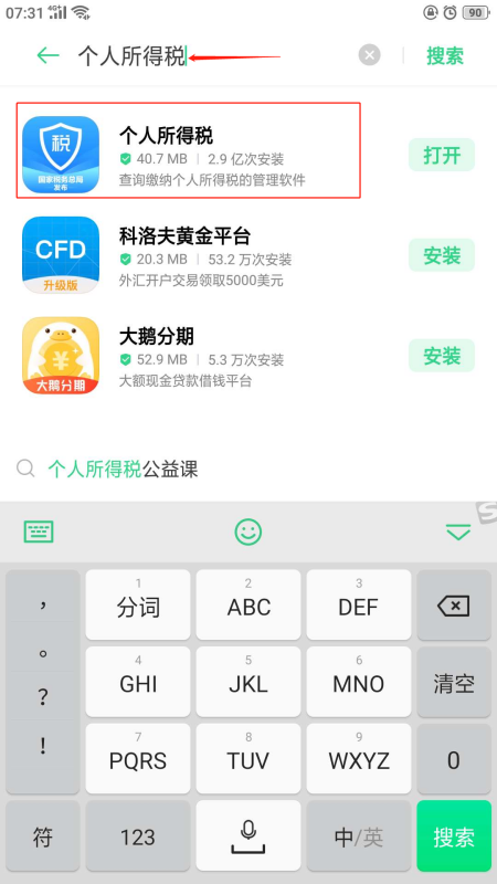1、登录手机的应用商店,然后搜索:个人所得税,如下图所示: