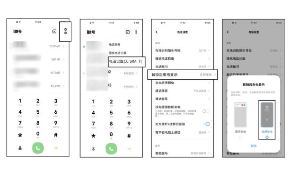 vivo手机可进入电话--点击右上角 圆点 --电话设置--解锁后来电显示--“全屏来电”。