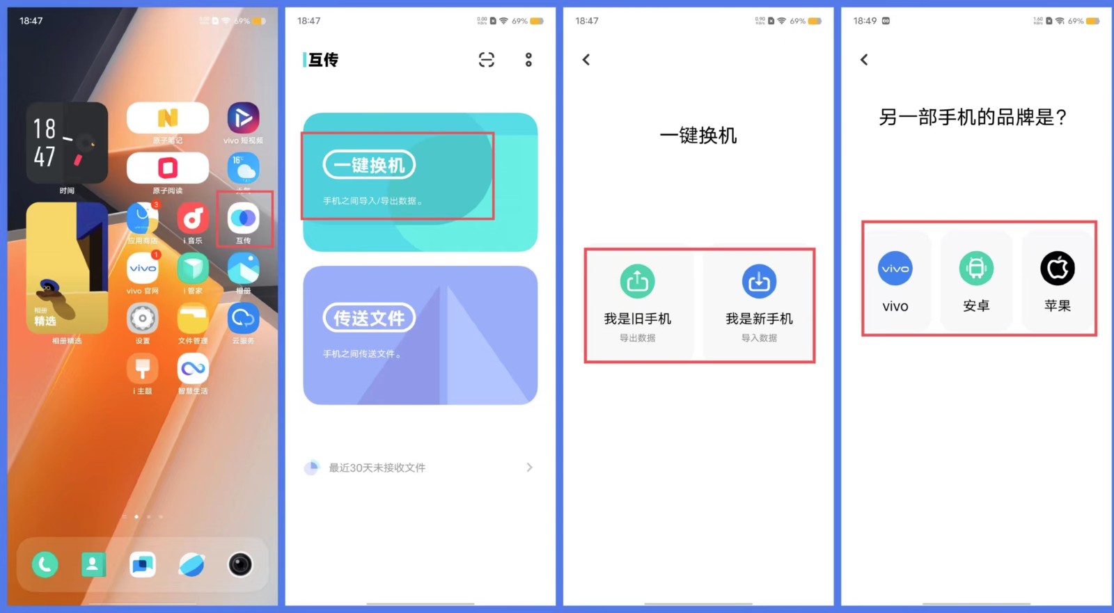 若是vivo手机,可通过互传的一键换机功能,将数据覆盖到另一部手机: