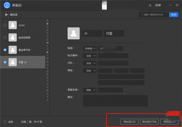 备份完成后,我们可以直接点击左侧的“通讯录”进入详情页,除了可以在线查看备份好的联系人,还能勾选需要的数据免费将其导出。