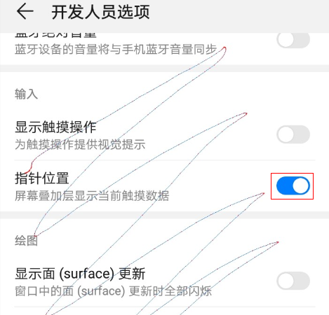 打开指针位置功能后,请用手指在屏幕异常的位置上滑动,查看划线状态,如下图: