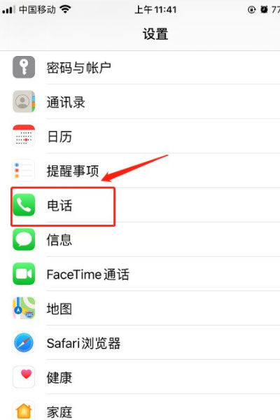 2、在设置页面找到“电话”图标,进入页面。
