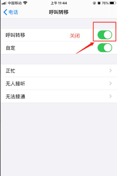 4、把呼叫转移右边的绿色按钮关掉即可。