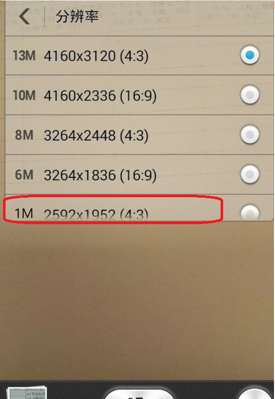 5、打开设置项后,输入分辨率设置。如果你想减少你照片的内存占用,你可以使用[1M分辨率]来拍摄小于1MB的照片。如图所示: