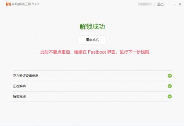 4. 看到“已解锁”的提示后,不要点击重启,保持在 Fastboot 界面,继续用线刷工具刷入 V7.1.9.0.LHOCNCL