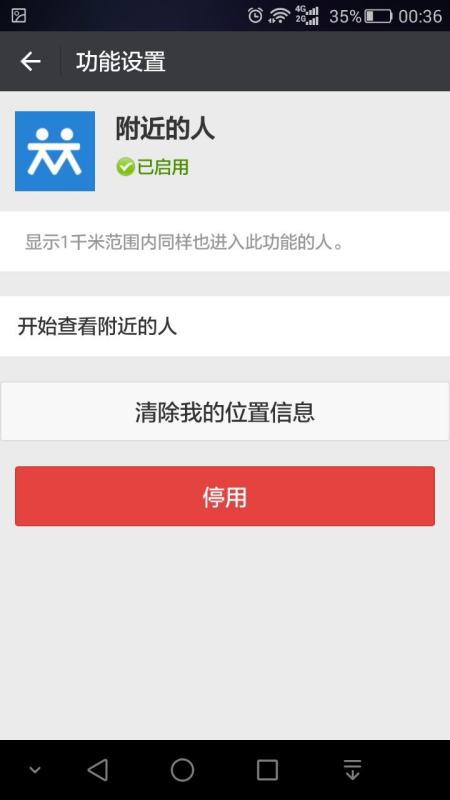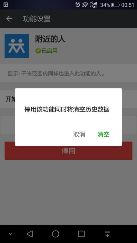 4.在已启用的功能里找到附近的人点击进入,进入后点击停用,会弹出提示“停用该功能同时将清空历史数据”,点击清空即可停用附近的人功能。
