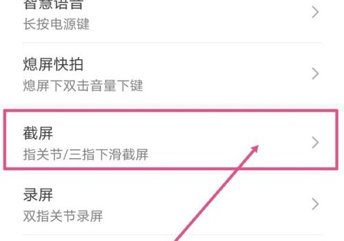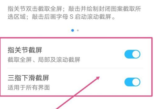 5、点击截屏,如下图,拖拽滑块向右打开指关节截屏和三指下滑截屏。