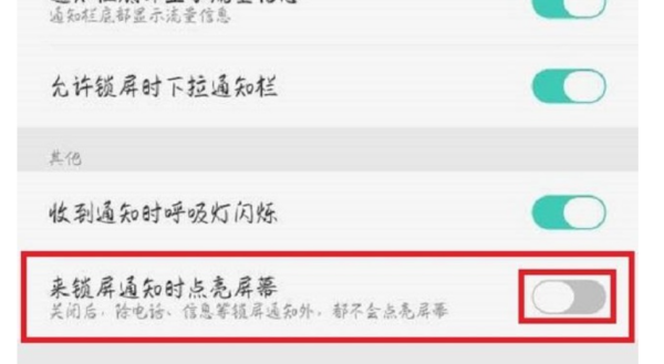 5、弹出通知与状态栏,找到最下方的来锁屏通知时点亮屏幕,在其右方,点击开关键,将其打开。