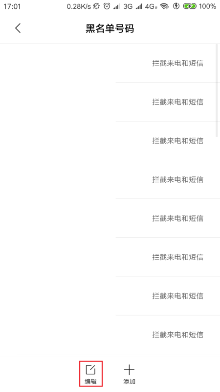 4、接下来,在黑名单号码列表中,点击页面底部“编辑”按钮。