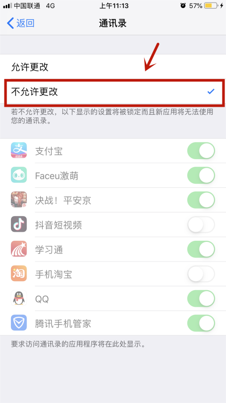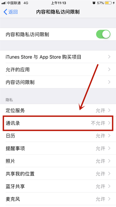 5、进入应用程序【通讯录】的访问限制管理中,默认为不允许更改。