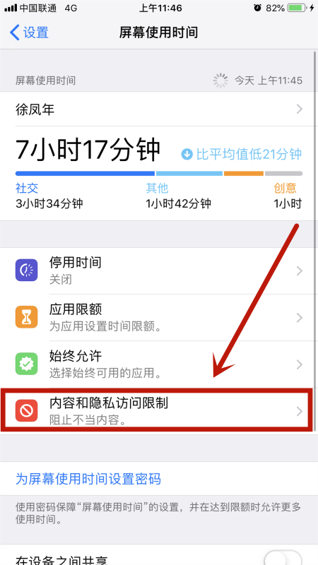3、进入【屏幕使用时间】的管理设置页面,选择【内容和隐私访问限制】功能。