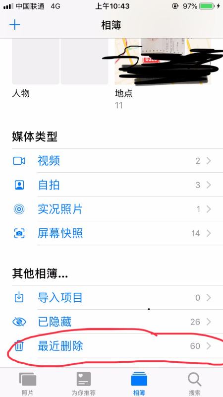 iPhone上的照片不小心删了,未超过30天可以在iPhone的相册中打开最近删除进行找回。