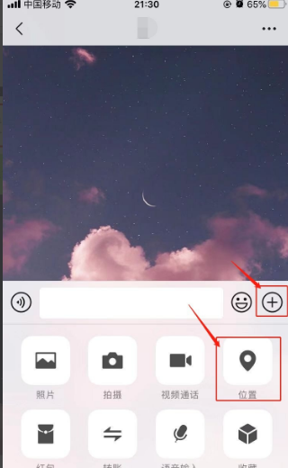 6、有更快捷的方法,可以利用微信来查看共享的位置。进入微信好友的聊天界面,点击聊天输入框右边的“+”小图标,然后展开操作选项内,选择“位置”。