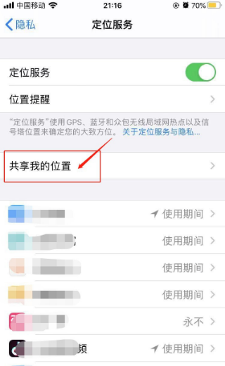 3、定位服务的操作页面,再点击进入“共享我的位置”。如下图所示: