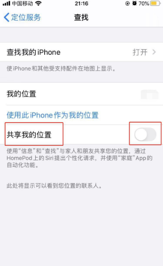 4、注意在查找的页面,如果想要能查看到位置,需要选择“使用此iphone作为我的位置”,并且打开“共享我的位置”。如下图所示: