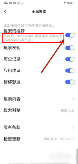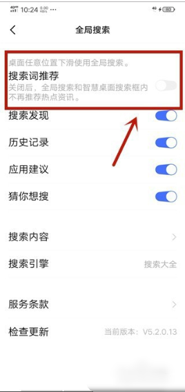 5、将搜索词推荐后的开关关闭,如图所示。关闭之后就不会再有手机锁屏广告了。