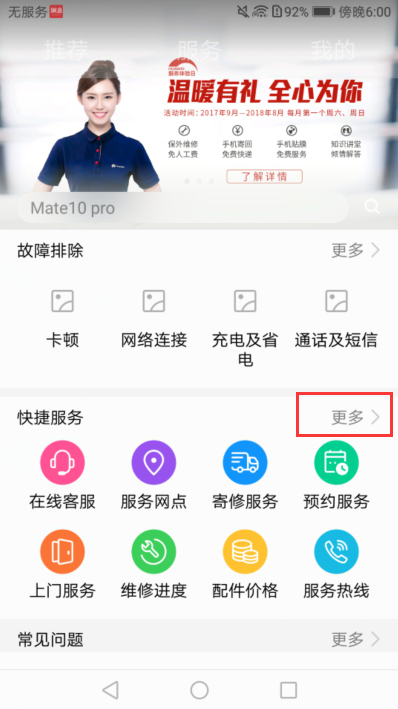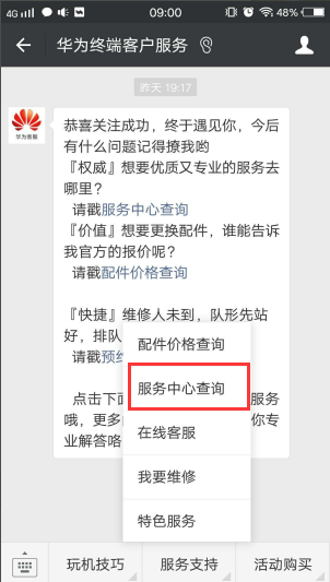 3、微信中关注“华为终端客户服务”公众号,在服务支持中点击服务中心也可以查询。