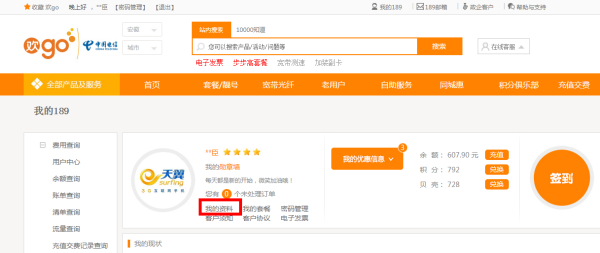 用户登录电信网上营业厅然后输入账号进行登录,登录后会跳转到个人中心,然后点击我的资料