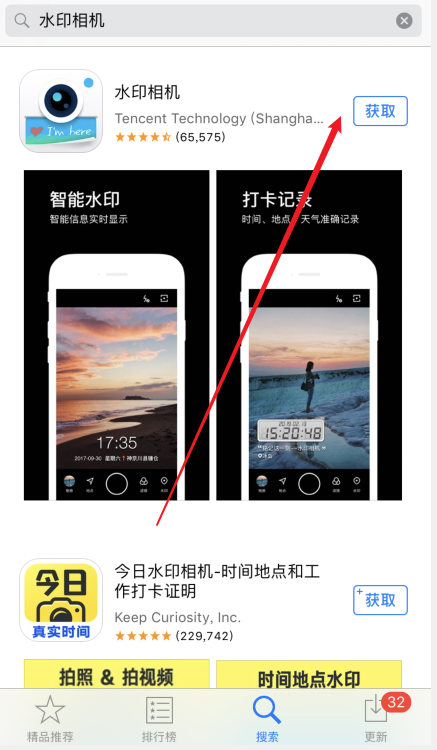 1、苹果商店搜索水印相机,然后下载。如图所示: