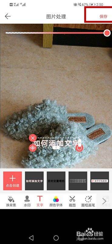 第七步,点击“保存”,一定要再一次保存,否则返回的话,图片自动取消之前的文字处理。