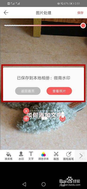 最后,出现“已保存到本地相册”,说明已经完成了文字添加,如下图所示。