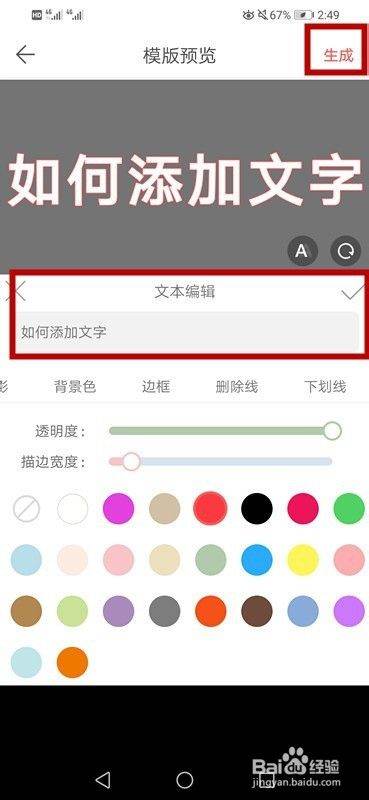 第六步,在文本编辑框里输入你想要添加的文字,例如“如何添加文字”,点击“生成”,如下图所示。