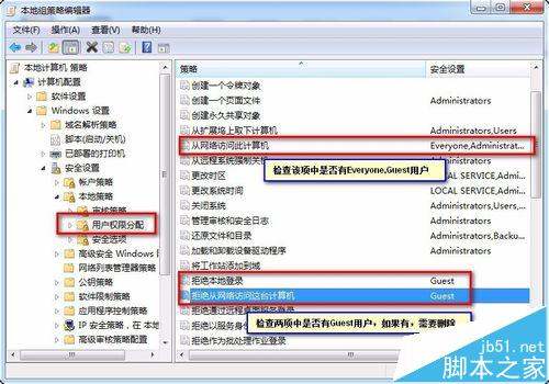 (3)将上述位置由【安全选项】切换到【用户权利分配】,检查并修改右侧“从网络访问此计算机”,“拒绝本地登录”,“拒绝从网络访问这台计算机”相关设置。