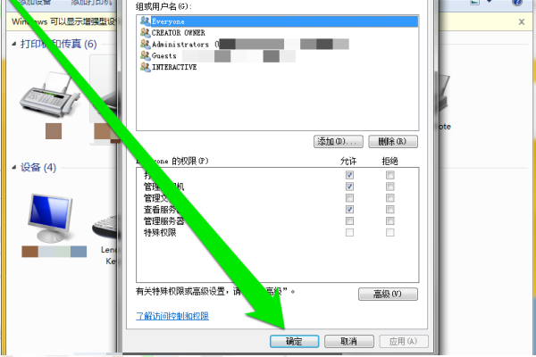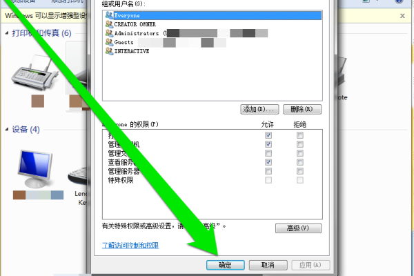 8、在打印机服务器页面点击应用按钮后,点击确定按钮。这时打印机就拥有了管理打印机的权限。