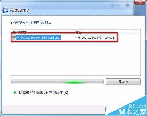 (2)搜索打印机,如果设置正确的话,这里应该可以找到XP下的共享打印机了;