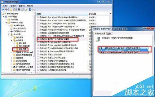 (2)打开【本地组策略编辑器】--【计算机配置】--【Windows设置】--【安全设置】--【本地策略】--【安全选项】,将【网络访问:本地账户的共享和安全模型】,设置为【经典-对本地用户进行身份验证,不改变其本来身份】;