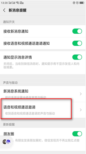 4、点击进入新消息提醒以后,选择语音和视频通话邀请选项,点击进入。