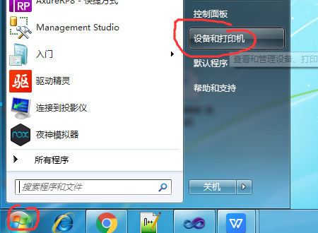 1、首先在win7 电脑桌面上,点击右下角“开始”图标里的“设备和打印机”选项。
