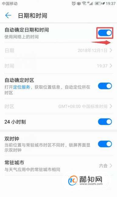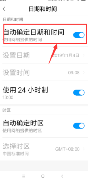 五、另外也可以将”自动确定日期和时间“一栏的开关开启,这样手机会自动核对校正日期和时间。