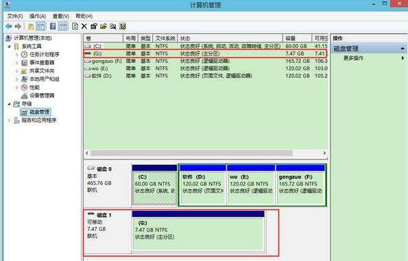 2、在计算机管理窗口中,点击储存→磁盘管理,在右侧可以我看我们需要操作的u盘,如图: