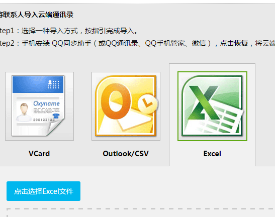 3.选择“EXCEL”,点击选择EXCEL文件,添加需要添加的EXCEL文件导入通讯录。