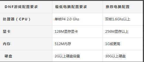 DNF的配置要求不是很高,主要是内存要求比较高,还有显卡至少1G才能保证高效果顺畅运行,内存4G比较理想,2G也可以勉强运行,CPU双核2.0就可以了。硬盘什么的都没什么要求。