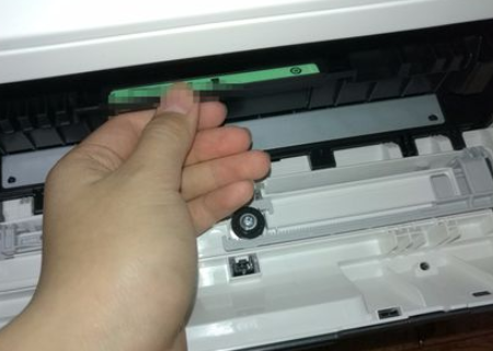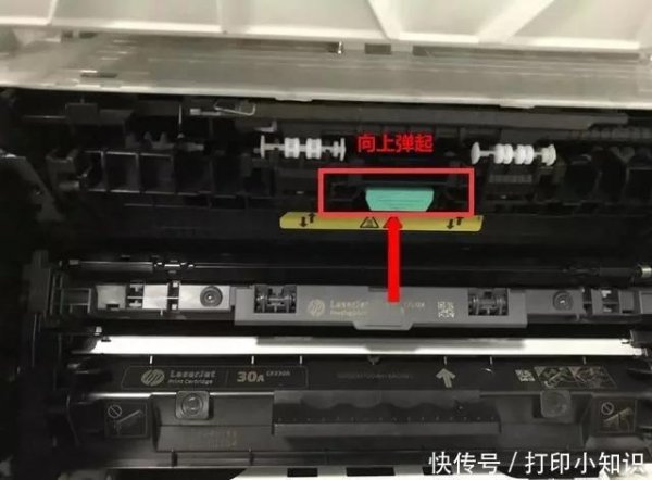 打开盖板后可以看到机器内部构造,在上方可以看到一个绿色的开关,向上弹起后就能看到双面打印单元。【提问】