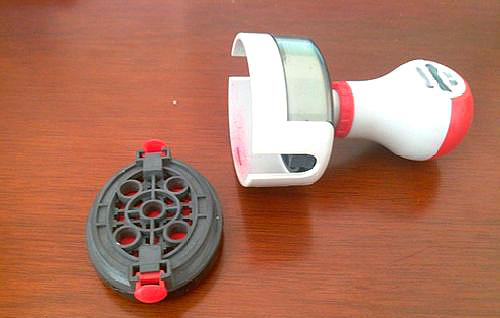 先将光敏印章所有部件全部拆下,其中橡胶章体和内部网格可以用小型一字螺丝刀从后面的加油孔往外顶。