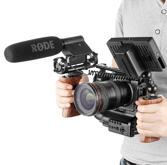 那大家在使用这些指向性话筒的时候,是怎么样把话筒加在单反微单上的呢?相信有了解过相机兔笼的人都知道,相机兔笼有一个很大的作用就是外接配件,像麦克风,监视器,闪光灯等这些配件都能很好地外接到单反和微单上,下图为参考图,大家可以参考一下。