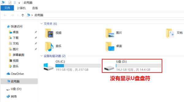 若笔记本插入U盘后,在“此电脑”中没有显示: