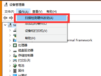 5、“USB大容量存储设备”项消失后,左击“操作”,从弹出的菜单中选择“扫描检测硬件改动”项。