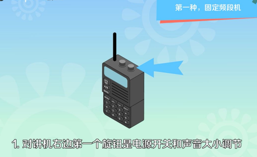 1、固定频段机右边第一个旋钮是电源开关和声音大小调节。