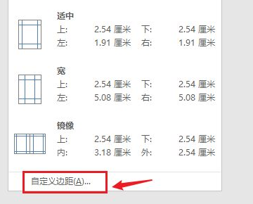 3、这时弹出白色框,点击【自定义边距】,如下图所示。