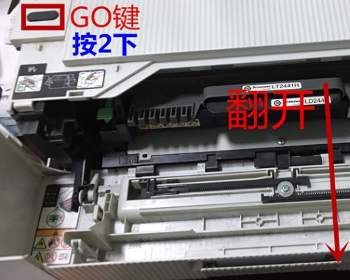 2、翻开打印机前盖,连续按打印机上面黑色GO,然后同时打开电源。静静等待所有指示灯亮起。