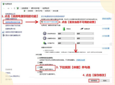 若没有休眠按钮,右击开始菜单依次选择【设置】【系统】【电源和睡眠】【其他电源设置】【选择电源按钮的功能】【更改当前不可用的设置】,勾选【休眠】后【保存修改】即可。