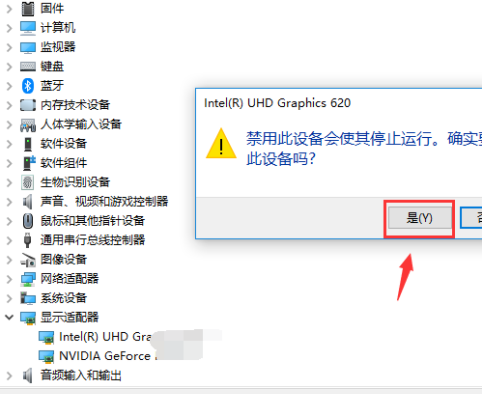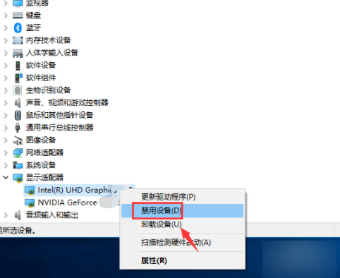 4、显示适配器你会看到两条显卡,右键单击你准备切掉的显卡,选中禁用设备,如下图所示。