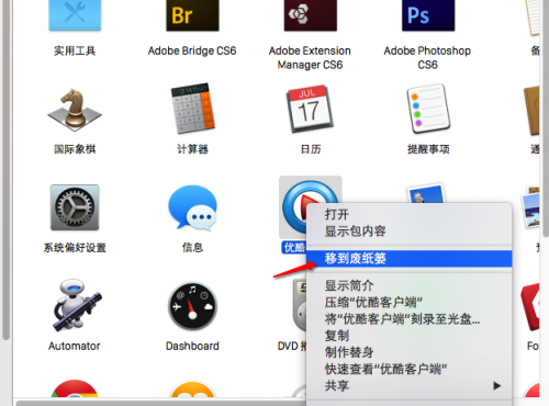 3、进入之后就能看见我们电脑上自己安装的所有程序,选择自己想要卸载的软件,点击鼠标右键,选择移动到废纸篓。